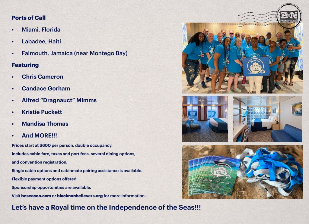 Prices for BN SeaCon 2024 are now based on current Royal Caribbean cabin pricing, in addition to the convention registration. Please contact us at info@blacknonbelievers.org today!